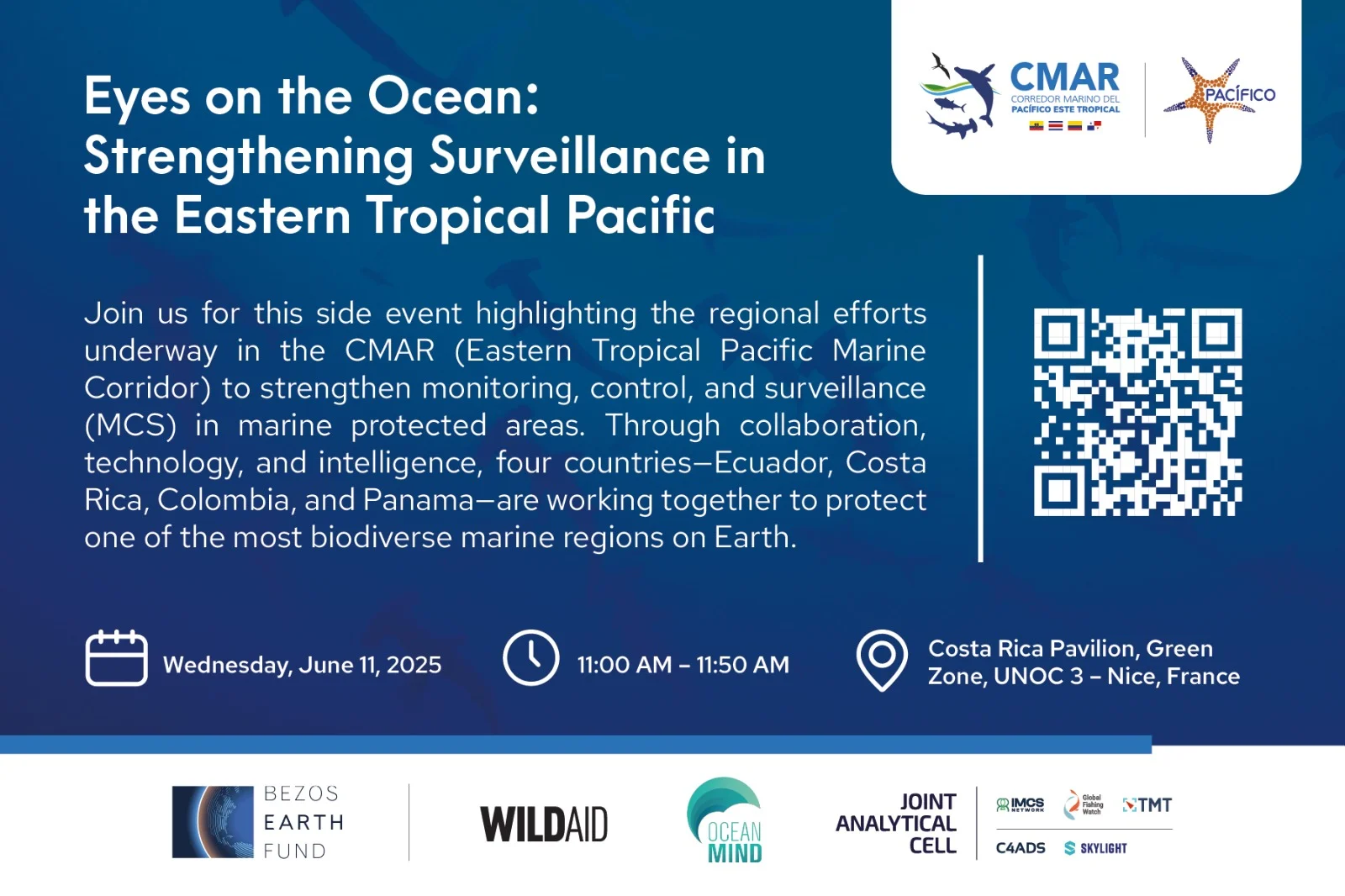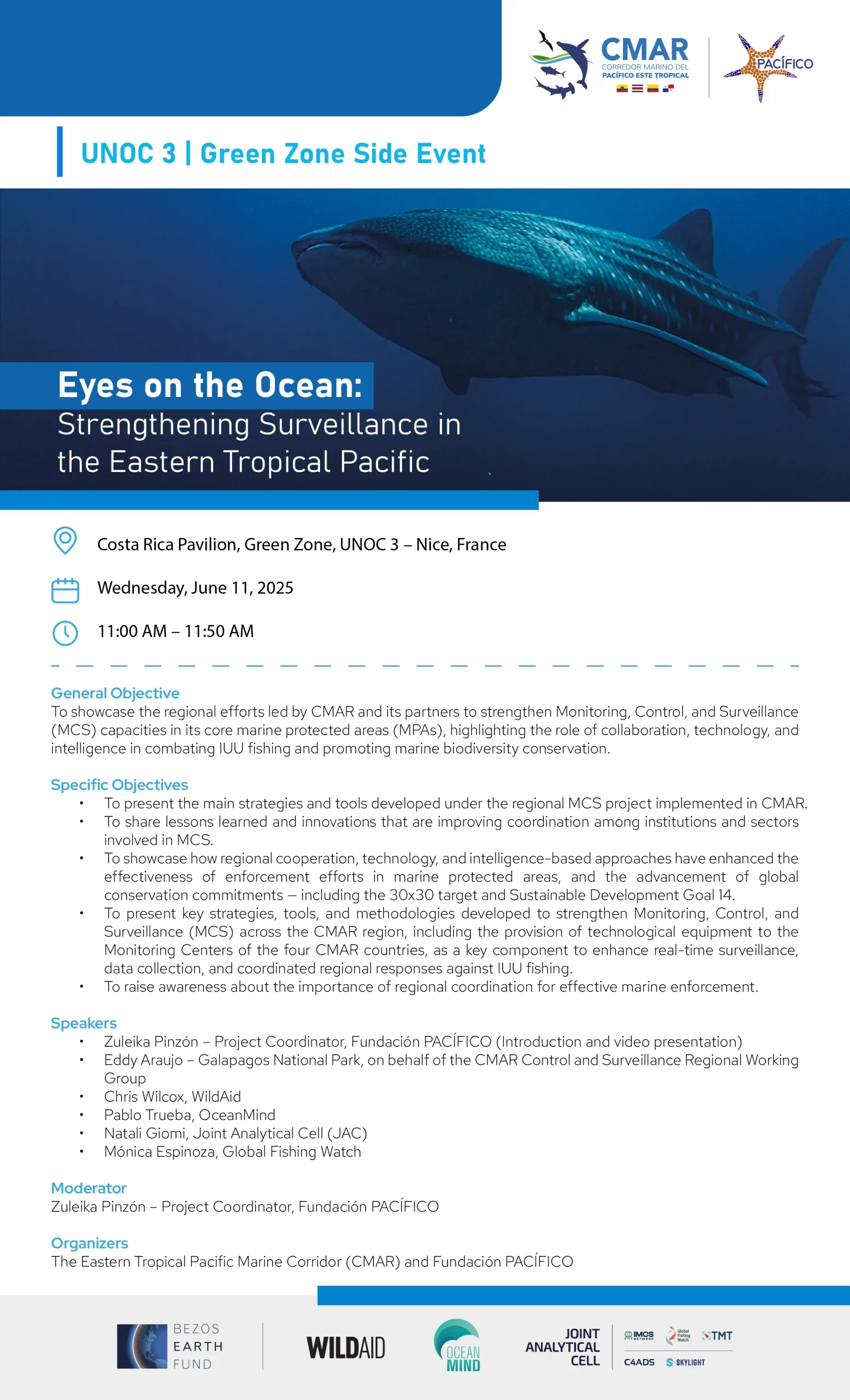Únete a nosotros en este evento paralelo que destaca los esfuerzos regionales en curso en el CMAR (Corredor Marino del Pacífico Tropical Oriental) para fortalecer la vigilancia, el control y la vigilancia (MCV) en las áreas marinas protegidas. A través de la colaboración, la tecnología y la inteligencia, cuatro países—Ecuador, Costa Rica, Colombia y Panamá—están trabajando juntos para proteger una de las regiones marinas más biodiversas del planeta.
